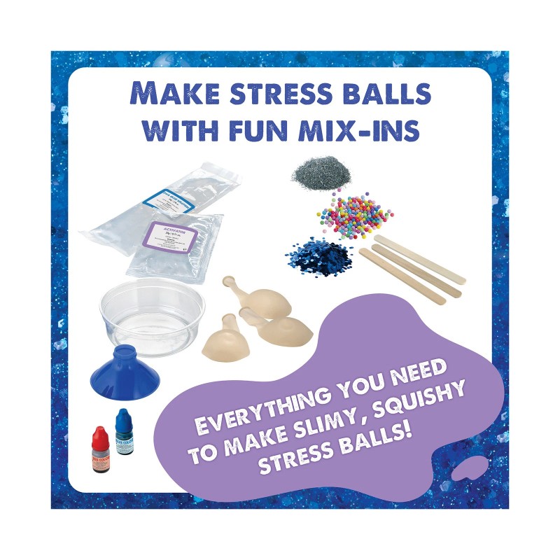 Mix it, squish it, and let the fun begin! Uncover your inner calm and create your own stress balls with this soothing, sensory science lab kit. Kids will love making three squishy slime stress balls, adding exciting mix-ins like glitter and beads for extra sparkle and sensory stimulation. Along the way, they'll explore the science of polymers and uncover the chemistry behind ooze, turning hands-on play into a fascinating learning experience. It's a fun and engaging way for kids to feel both smart and centered! This kit includes everything you need - plus step-by-step instructions - to make three squishy stress balls. It's hands-on, slimy fun that's as satisfying as it is entertaining!