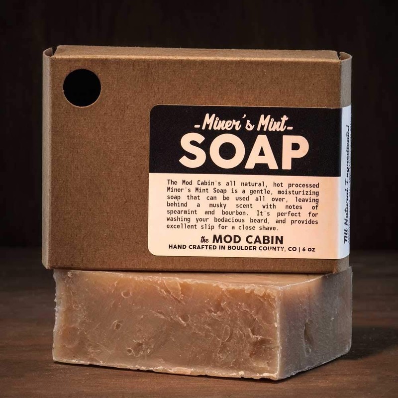 We use naturally sourced plant extracts, essential oils, and tree resins to handcraft The Mod Cabin all natural Miner’s Mint Soap, and we hot process it the old fashioned way. The result is a powerful bar of soap full of natural glycerin, a skin loving humectant, that will leave your skin and hair feeling clean and moisturized. A true multi-purpose bar, it’s an excellent hand and body soap, perfect for washing your bodacious beard, and provides superior slip for close shave. The Mod Cabin Miner’s Mint soap has a substantial musky, masculine aroma with hints of refreshing spearmint and sweet, heady bourbon. One of our most popular fragrances, that harkens back to traditional men’s cologne, without the chemicals. Palm oil free.