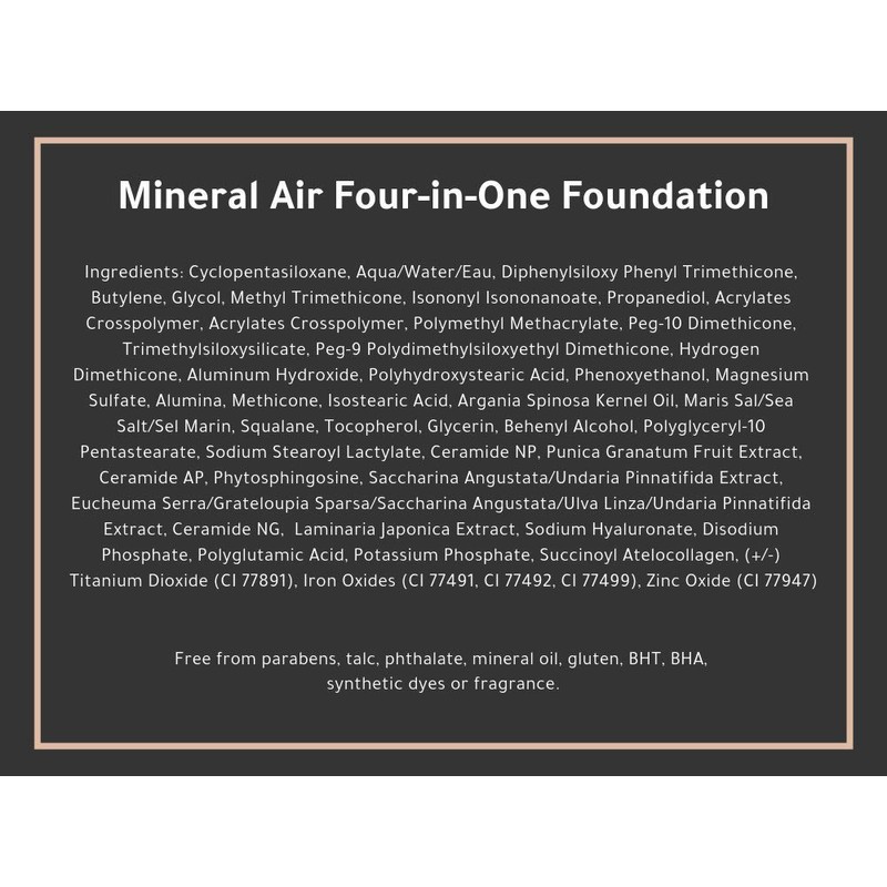 - ''' Four-in-One Mineral Foundation formula combines primer, concealer, hydrator and pigment#||# Lightweight multi-tasking formula eliminates the need for heavy layering#||# Delivers seamless finish, superior to traditional mineral makeup#||# Available in seven shades which may be mixed for precision matching or contouring'''
