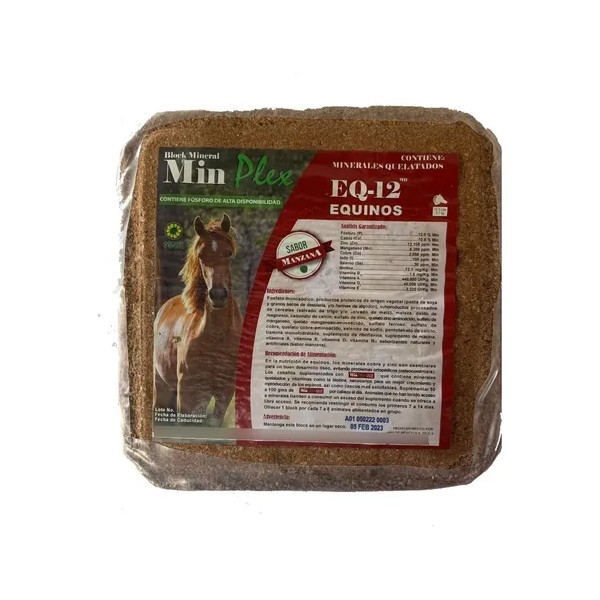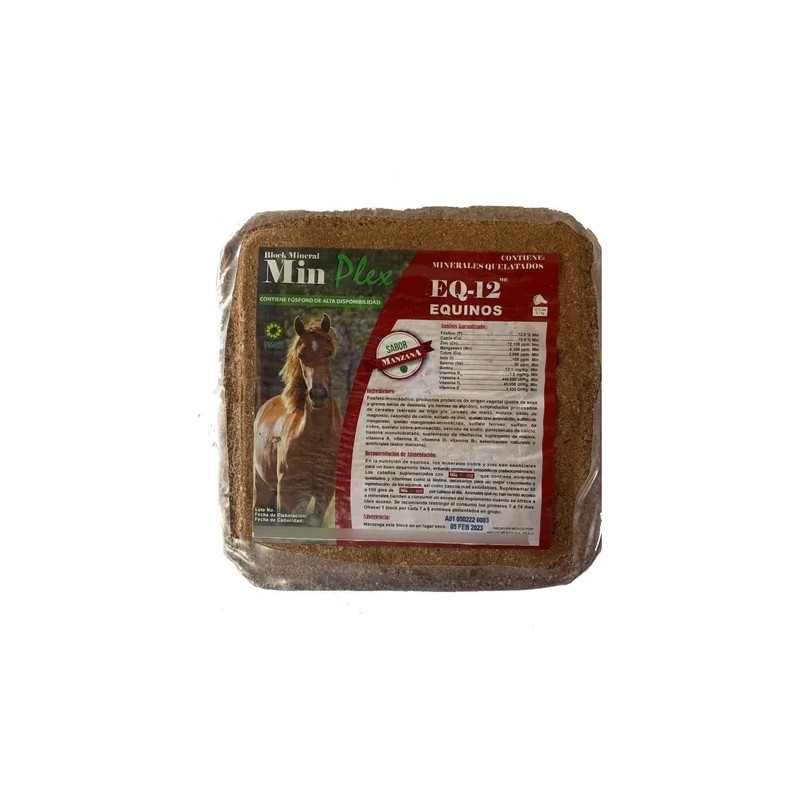 Descripción Limpia: El Block Mineral Minplex EQ-12 (MR) contiene minerales quelatados, cobre y zinc, esenciales para un buen desarrollo óseo, cascos saludables, crecimiento y reproducción de los equinos.