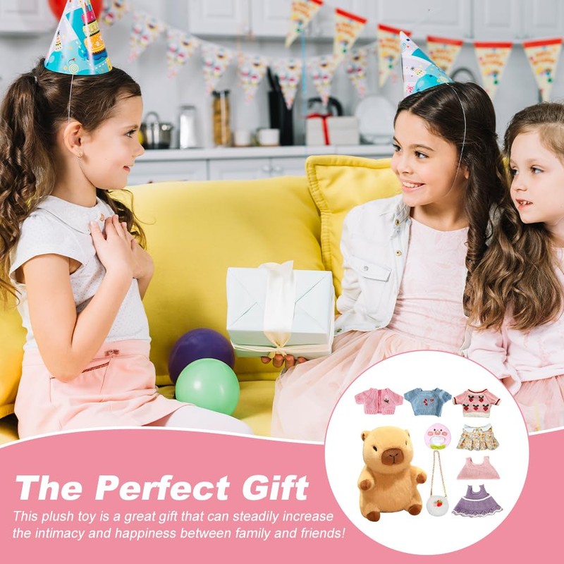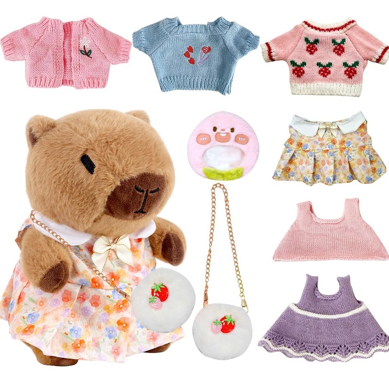 - Creative Capybara Plush Toy: Capybara plush toy has a unique three-dimensional shape and cute expression that looks fun and eye-catching. It comes with 1 pink hat, 1 backpack, 2 tops, 3 skirts. Cute Capybara cuddly toy stimulates your child's imagination and is perfect for imaginative play, dressing up and cuddling, making it an adorable companion for children with endless possibilities.