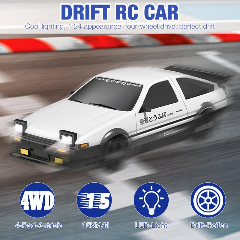 • Remote controlled high-speed drift car: remote controlled car for children is small, lightweight, in scale 1:24, looks cool and realistic and RC drift car can reach speeds of 30 km/h. RC cars toy has a powerful and durable four-wheel drive that ensures smooth driving even in sharp corners. Children can enjoy the thrill of drifting and realise their racing dreams.