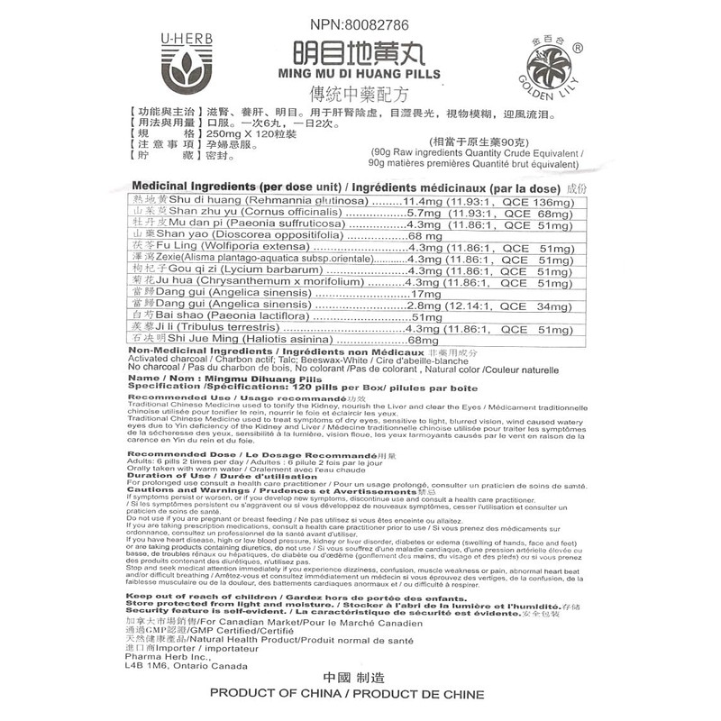 A popular all natural ingredients Traditional Chinese Medicine used to tonify the Kidney, nourish the Liver and clear the Eyes. Traditional Chinese Medicine used to treat symptoms of dry eyes, sensitive to light, blurred vision, wind caused watery eyes due to Yin deficiency of the Kidney and Liver. NPN 80082786. Super concentrated formula, two times a day, 6 pills each time. 120 pills a bottle can last 10 days . For more information see Health Canada link https://health-products.canada.ca/lnhpd-bdpsnh/info?licence=80082786.