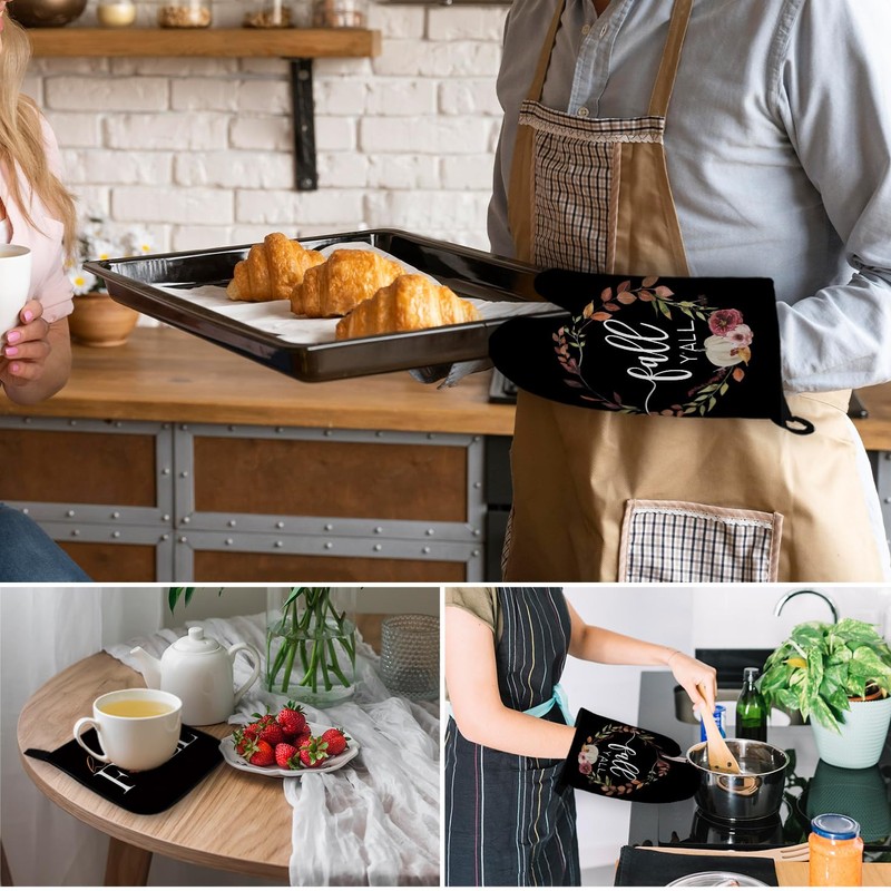 Mingnei Hello Fall Pumpkin Oven Mitts and Pot Holders Sets, Fall Pumpkin Kitchen Decor,Black Fall Maple Leaf Heat Resistant Hot Pods Kitchen Decor for Cooking Baking BBQ, Fall Oven Glove Set Gifts