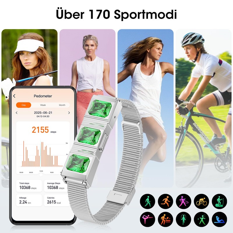 Mingtawn Smart Bracelet for Women Health Fitness Tracker Pedometer Blood Oxygen HRV Sleep Tracker Fashion Emerald Bracelet with Message/Call Reminder (Silver)