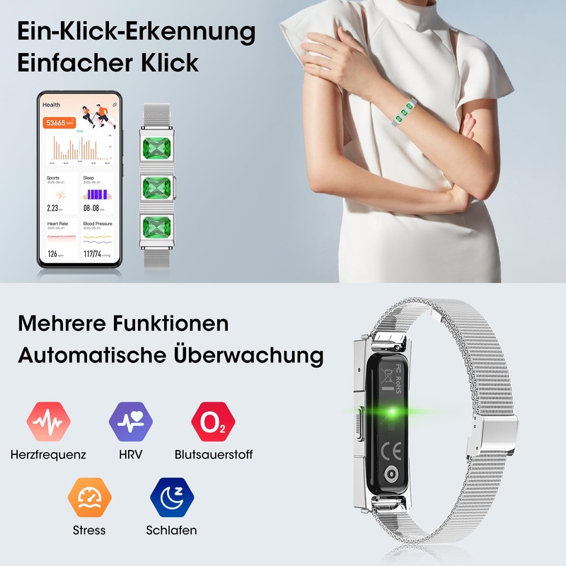 - Automatic monitoring: Heart rate (every 5 minutes), blood oxygen (hourly), HRV (hourly) and stress (every 30 minutes) are measured automatically at regular intervals. If you want to check your current health data, you can open the app and capture multiple data at the same time with the one-click measurement function. This saves you valuable time and allows you to check your physical condition at any time.