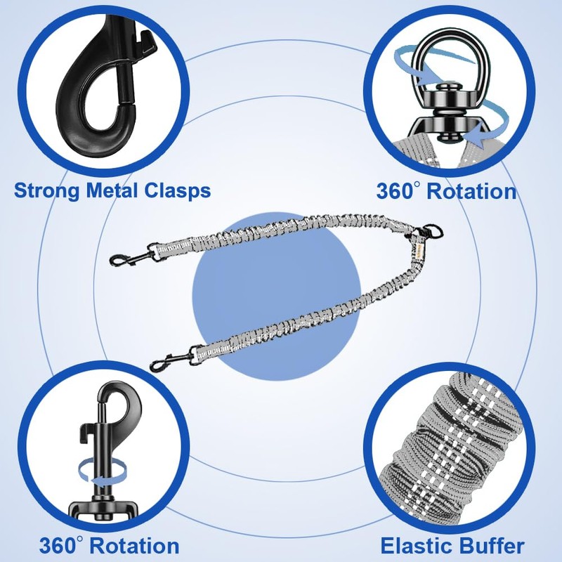 - Anti-Tangle Design: The 360° rotating buckle design can be automatically adjusted when the dogs cross, which can effectively prevent the two dogs from getting entangled with each other during the walk, saving you time to organize and untie the rope. Moreover, this design can also reduce the damage to the traction rope caused by entanglement and extend the service life of the traction rope