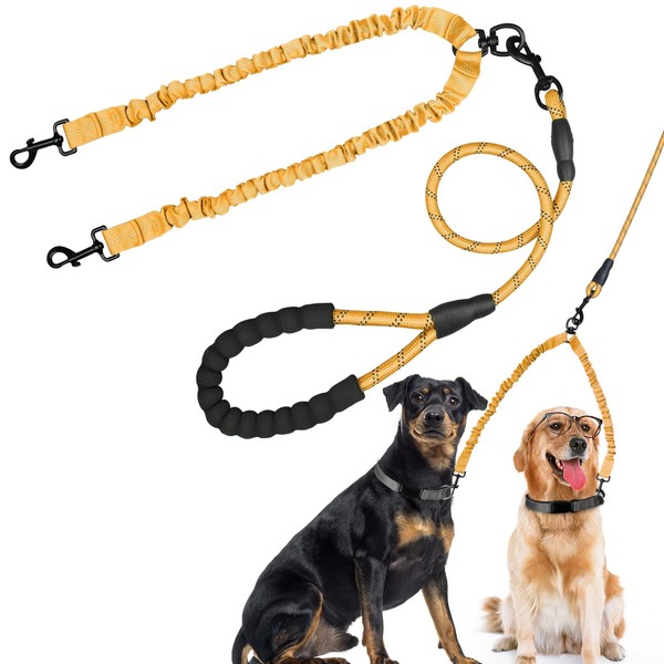 MingXpets Double Dog Leash, Dual Dog Leash, 360 Swivel Tangle Free Bungee Walking Training Leash for Large Medium Dogs, Shock Absorbing Bungee Reflective Leash for Two Dogs, 18~120 lbs, Yellow