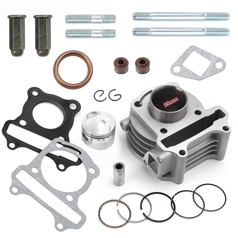 - 🏍 Package including: 1PC x 39mm cylinder body,2PCS x gasket,2PCS x oil seal and piston kit Piston Ring,Piston Pin,Piston Pin Clip,Tensioner Gasket,Exhaust Gasket,Intake&Exhaust Studs,Exhaust Nut