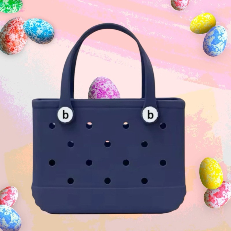Embrace practicality and style with the Mini Bag in a chic Navy Bogg model look. This beach bag is not just a fashion statement, it's a functional accessory designed to keep your essentials secure and accessible. Crafted from durable, weatherproof rubber, it's equipped with a double handle in a matching navy hue, ensuring comfort and ease of carrying.The tote's modest dimensions, 10.64 inches in width and 8.26 inches in height, make it an ideal companion for your daily errands or a weekend getaway. Its solid color and matte finish offer a versatile aesthetic that complements various outfits, from business casual to cocktail attire. Unbranded and straightforward, this bag is a seamless blend of convenience and contemporary design. This item would make the perfect Easter Basket for that special child or teenager in your life.