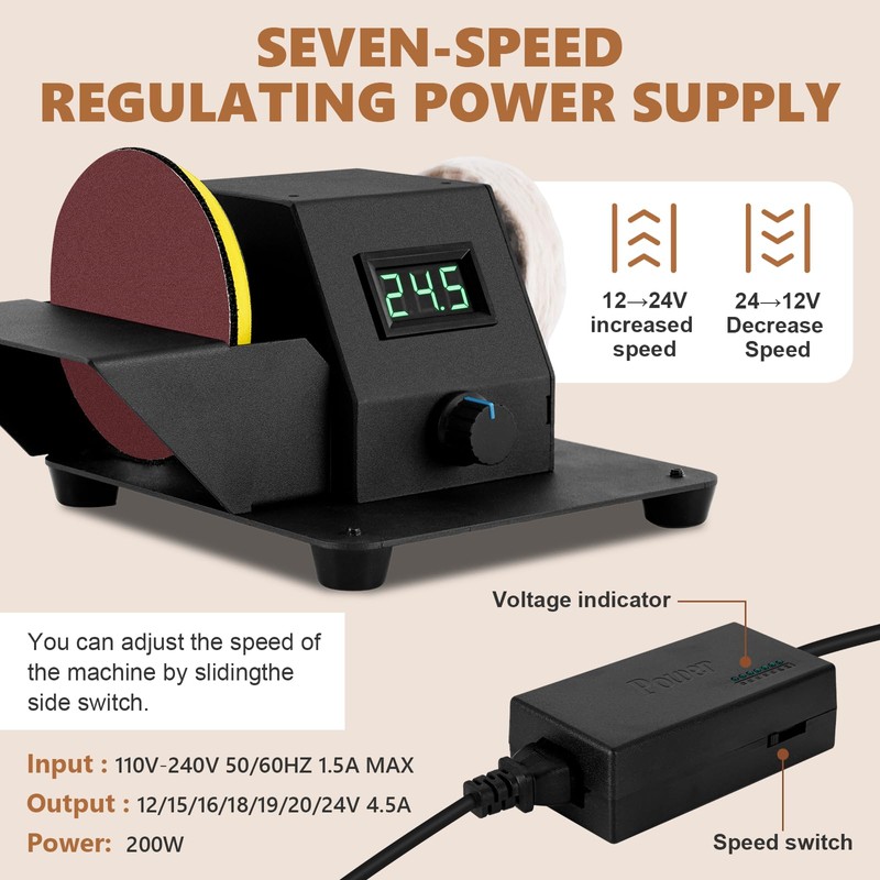 【Seven-Speed control】: You can adjust the speed of the bench buffer polisher machine by sliding the side switch on the power adapter according to your sanding needs. 12→24V: Increased speed, 24→12V: Decrease Speed.