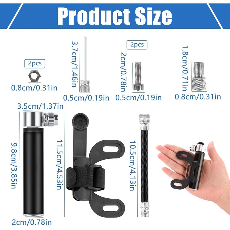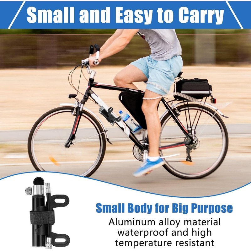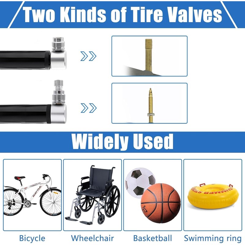 - Wide Application This portable pump is suitable for inflating various types of bicycles, such as mountain bikes, road bikes, road bikes, but also wheelchairs, strollers and sports balls such as basketball, football, rugby, etc.