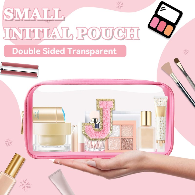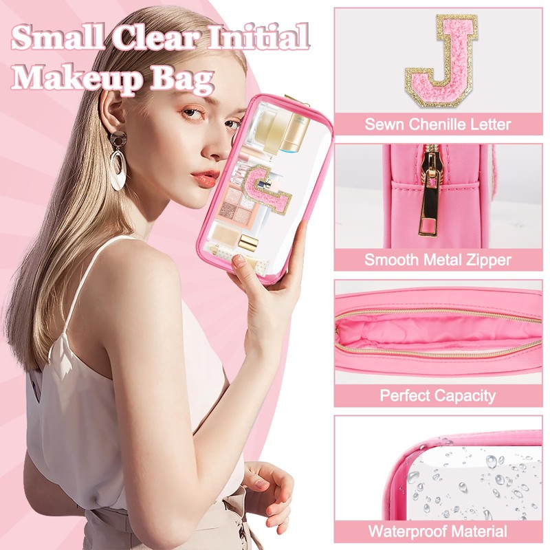 Mini bolsa de maquillaje transparente con inicial personalizada, de nailon Preppy A-Z, con parche de chenilla, con cierre, bolsa pequeña y bonita de viaje, bolsa de aseo, Pequeño-rosa, J