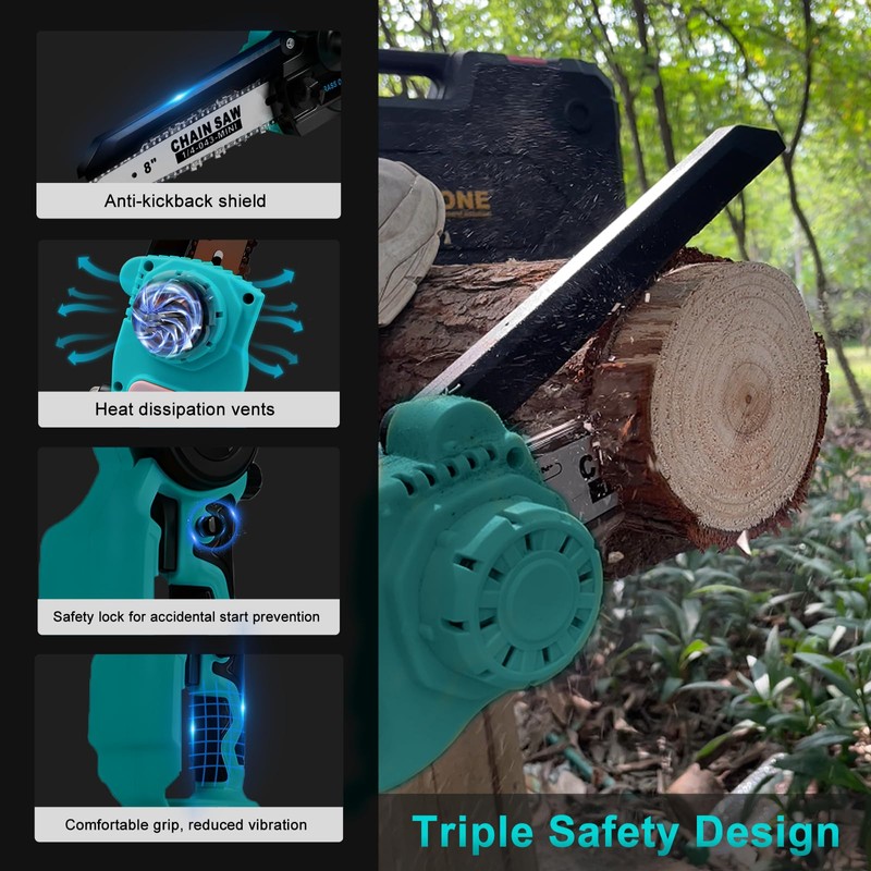 • đŸ›Ąïžă€5-in-1 Safety Protection System】 Your safety matters. Features include: 1.A safety lock that must be pressed along with the trigger to start; 2.A front guard to prevent wood splashing; 3.Non-slip rubberized grip for better control; 4.Protective goggles and gloves; 5.A secure chain guard for storage and transport. All backed by thoughtful design and safety-first engineering.