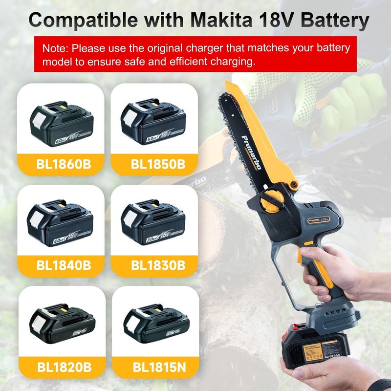 - 【Compatible With Makita Batteries】Prunarbo mini chain saw cordless is compatible with Makita 18V MAX battery, including BL1820、BL1830B、BL1840B、BL1850B、BL1860B. If you already own this batteries and chargers, it will be convenient and cost-saving to choose our body machine.
