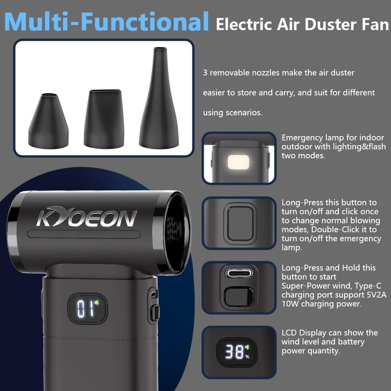 - Partable&Easy to Install: Three removable nozzles makes the product easier to store and carry. Long-Press the normal speed button 3 seconds to turn on the air duster and show level 1 speed; click once, switch to higher speed level 2~5; Long-Press the super-power speed button and hold to turn on the 150000 RPM air duster. Double click the normal speed button to turn on the emergency light.