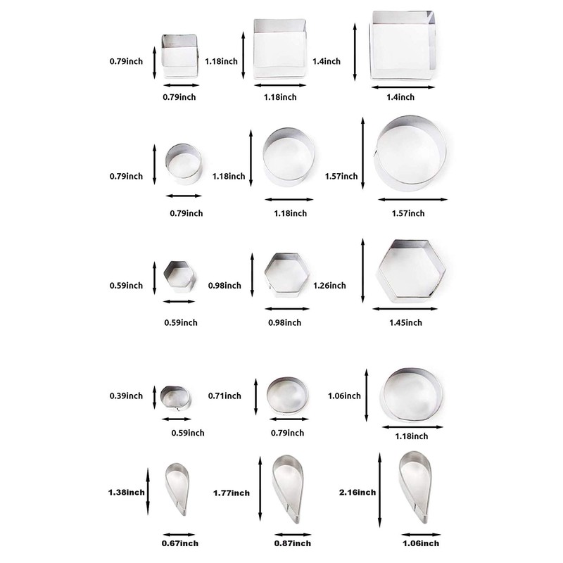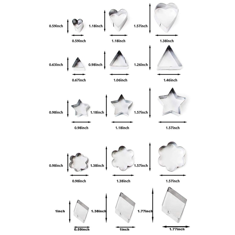 - 10 assorted shapes in 3 different MINI sizes. With shapes of Star, Flower, Hexagon, Round, Heart, Square, Triangle, Oval, rhombic, Raindrop. Diameters of every three ones about about 0.39 - 1.57 inches. Please refer to size description in the pictures.