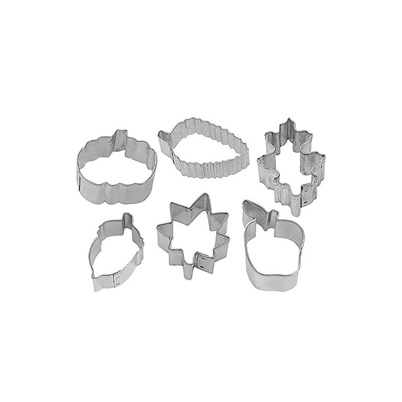 - Set of 6 tin-plated steel cutters. Contains: acorns, pumpkin, oak leaf, maple leaf, aspen leaf and apple, all approx. 1.5" to 1.75" tall.