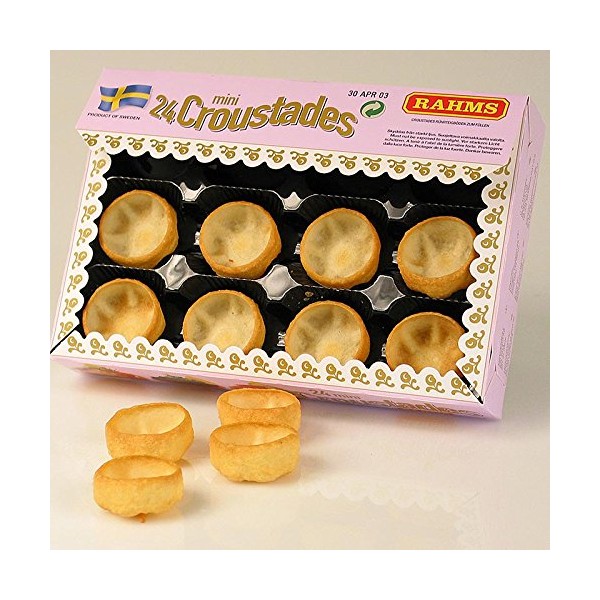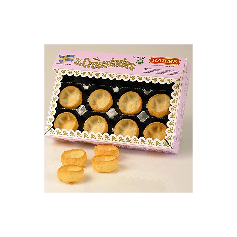 Mini croustades, diameter 3.8 cm, shortcrust dough, 50 g, 24 pieces croustaden (from shortcrust pastry) can be filled cold or warm in savory variations. For warm fillings, the small bowls are preheated in the oven or pan and served immediately after filling. With a cold filling, the croustades remain crispy for a long time if they are previously brushed with liquid butter or laid out with a dry salad leaf. Shortcrust pastry tarts for filling. Ingredients: wheat flour, palm oil, whole milk, eggs, salt, skimmed milk powder, cream. This is how croustades are served crispy: Warm filling: Preheat the croustaden in the oven or in the pan, fill with warm filling and serve immediately. Cold filling: croustades stay crispy for a long time when brushed with liquid butter or lined with a salad leaf. Store in a cool, dark and dry place. Made in Sweden. Features: animal milk protein