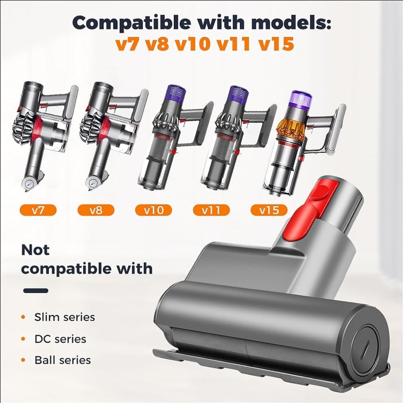 - ♻ Perfect Fit:This mini head tool is meticulously crafted to seamlessly integrate with Dyson V7, V8, V10, V11, and V15 vacuum cleaners, ensuring optimal compatibility and performance. Please verify your machine model before ordering to guarantee a perfect match.