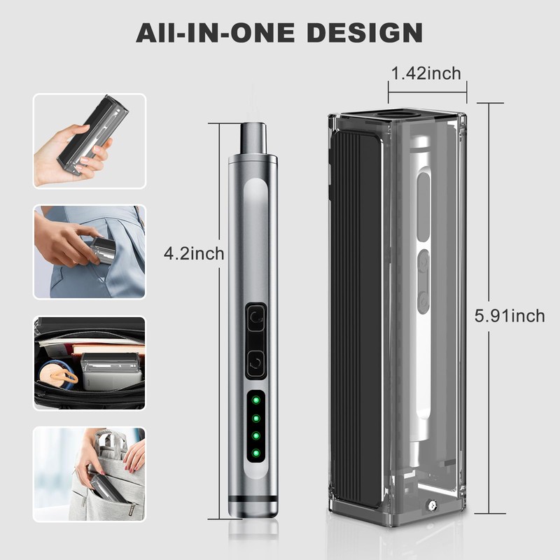 • Organized Magnetic Storage: The mini electric screwdriver set comes with a compact magnetic case that keeps the screwdriver and its 42 bits neatly organized. The case features a convenient pop-up mechanism, providing a satisfying experience with each open and close. Both the chuck and the bits are magnetic, allowing for easy attachment and stability