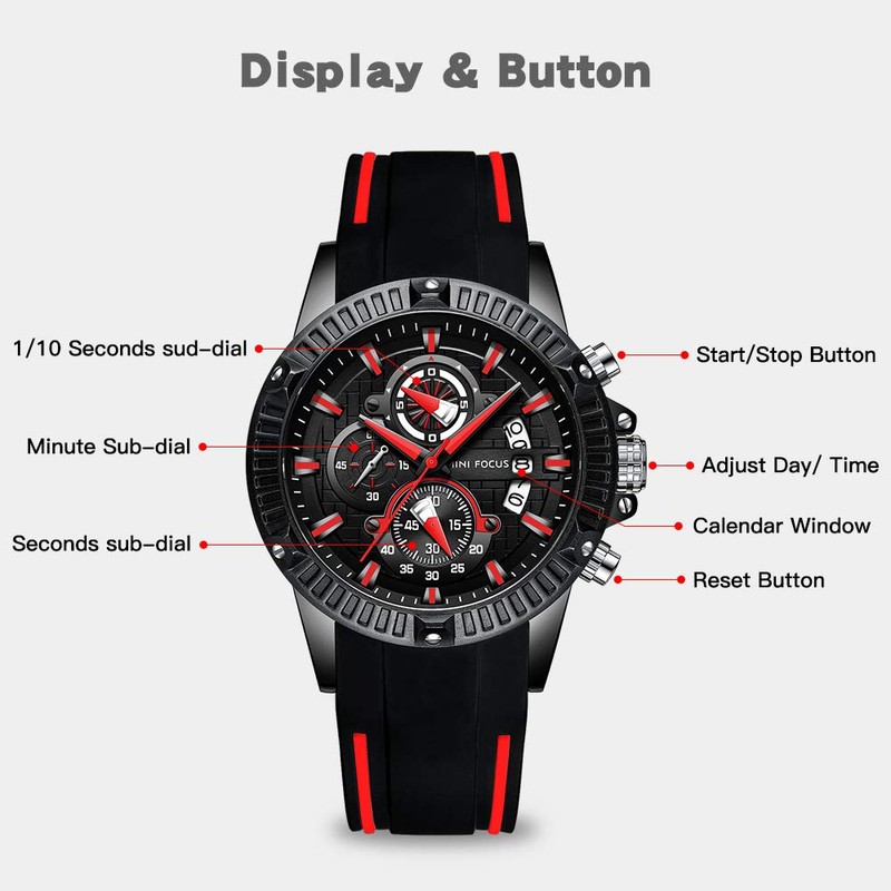 Mini Focus Mens Watches Military Sports Watch (Chronograph/Waterproof/Luminous/Calendar) Silicon Band Quartz Watch for Men (Red-Black)