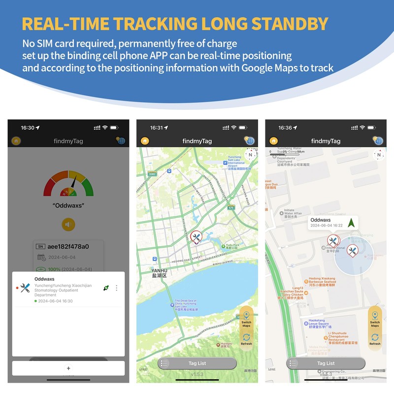 - Real-Time Location Tracking No SIM card is required for this GPS tracker. Simply download the "OmyTag" app from the Google Play Store for Android devices, or the "FindMyTag" app from the Apple App Store for iOS devices. Connect the tracker via Bluetooth, and it will automatically transmit a secure signal every two seconds. Nearby Apple devices, such as phones, tablets, or computers, will detect and upload the location data to Apple’s cloud servers. You can then view the exact location on a map through the app, allowing you to track the situation around the device discreetly and in real time.