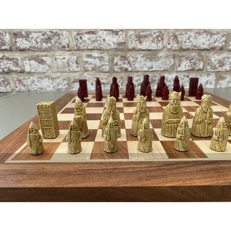 • Replica Mini Isle of Lewis chessmen crafted from ground stone resin|Historical chess set with cream and red chess pieces with shading and fine detailing|Featuring a king height of 2 inches - all chess pieces are felted|A quality set of Lewis chess pieces made in the UK by Berkeley Chess|Chessboard not included - we recommend a board with squares measuring 30 - 36mm for this Lewis chess set