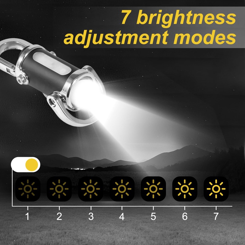 - Brightness Adjustment Function : This keychain light is equipped with 7 brightness modes adjustment function , from low light closeup to wide angle illumination , users can change easily according to the actual needs , to meet the reading , searching , camping , rescuing and other uses