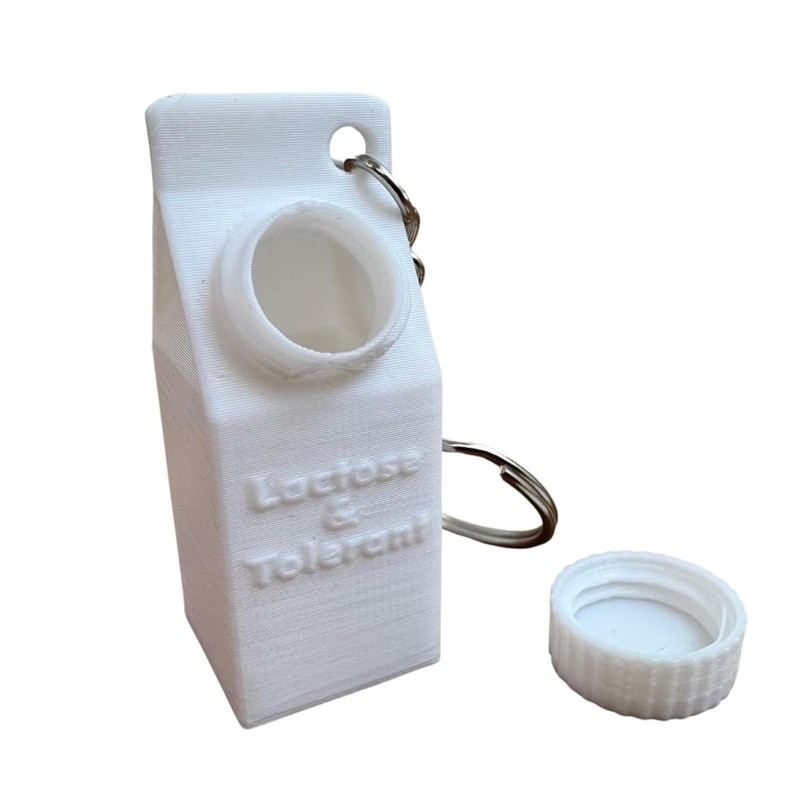 - MILK BOX KEYCHAIN:This 3D printed lactose Intolerant Pill Container can safely store your medication, keeping your lactase enzyme pills safe and sound. Additionally, it can serve as a convenient keychain