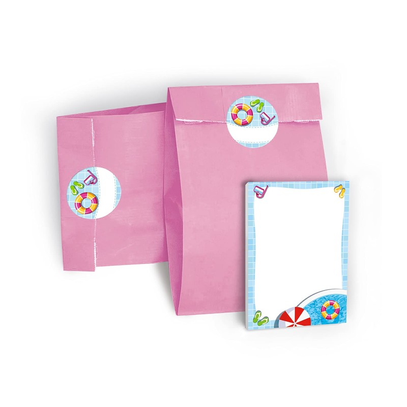 Mini notepads + gift bags / purple + stickers for swimming pool party favours at birthday children's birthday party boys girls