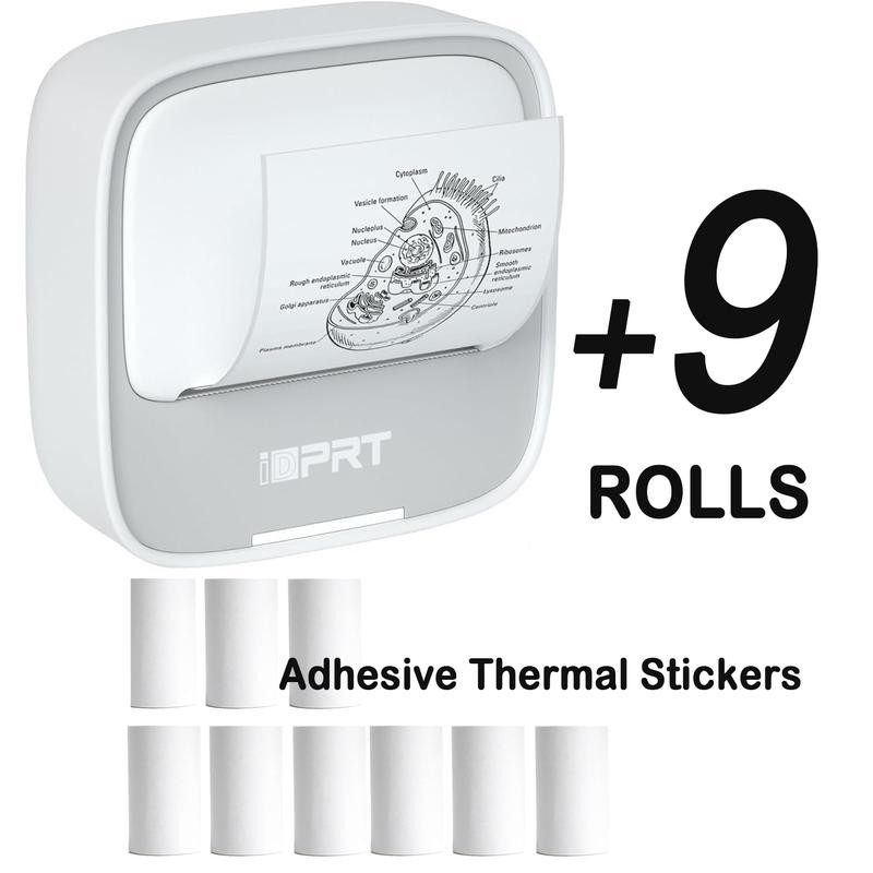 Mini Printer with 1 Roll of Stickers – Portable Bluetooth Inkless Thermal Printer for Study Notes, Pictures, DIY, and Labels:_White-Gray Printer + 9 Rolls