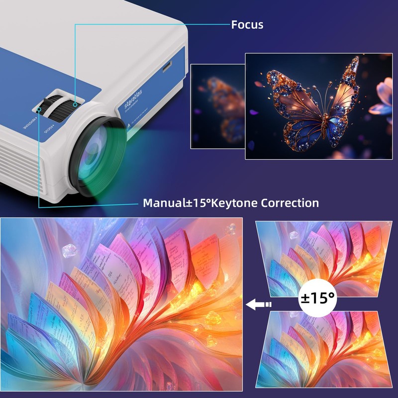 - 【200-Inch Giant Screen, ±15° Keystone Correction】Tv projector provides 40-200 inches of projection display at a projection distance of 3.28-19.68 ft, with a 4:3/16:9 aspect ratio, 50-100% zoom function and 15° keystone correction, making it a breeze to set up and get the perfect viewing position. support desktop/ceiling/tripod placement, which can achieve the best viewing effect in indoor home theater and outdoor movies, bringing an immersive viewing experience.