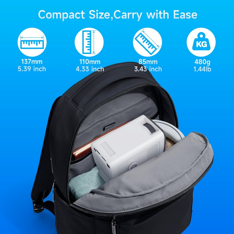 - 【Small,& Portable】Measuring 16cm in length, 9.5cm in diameter and weighing only 0.7kg. The compact size and light weight make this mini projector easy to carry.