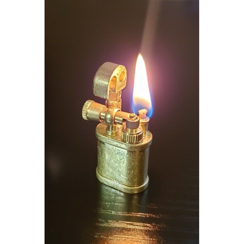 This is a brand new mini retro brass looking lighter. Runs on any lighter fluid (lighter fluid which is found everywhere.) It has the classic roller side strike for ignition.