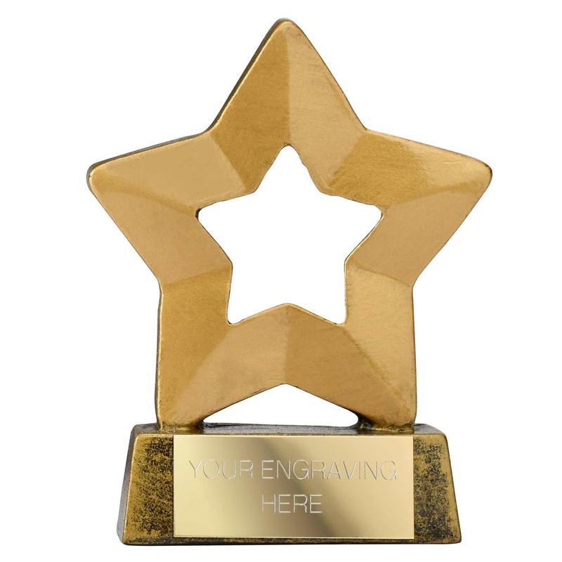 Gold resin mini stars trophy award, measuring 8cm. Incorporating a gold star, set on a contrasting gold base. The base holds an engraving plate. Free Engraving