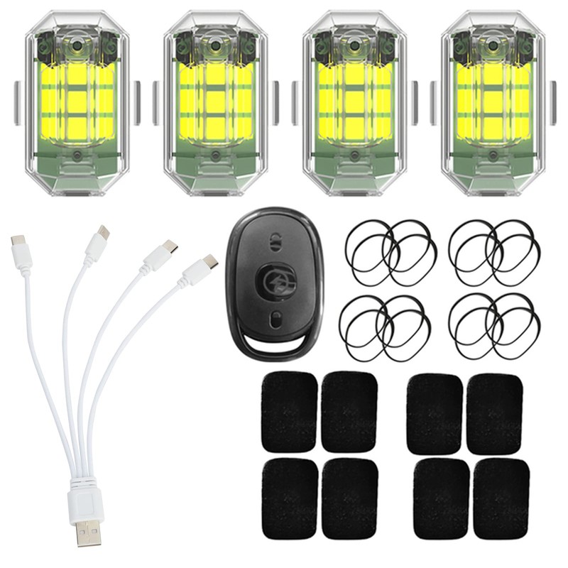 - 📦【What You Get】The package contains: 1 x remote control, 4 x mini strobe lights, 1 x USB data cables, 8 x Velcro and 8 x rubber rings. If you have any questions or dissatisfaction with this product, please feel free to contact us, we will give you a satisfactory answer within 12 hours.