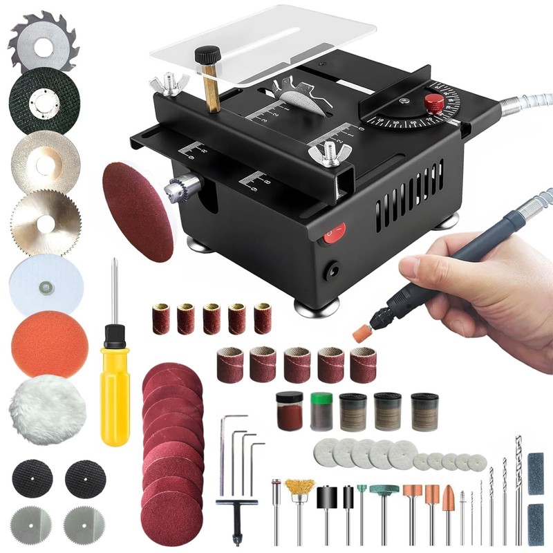 This all-in-one table saw integrates cutting, sanding, engraving, and drilling capabilities. It comes equipped with four different types of blades, enabling you to cut through balsa wood, veneer boards, PCB circuit boards, and plastic objects with ease. The drill chuck allows for the attachment of sanding or polishing heads, or can be paired with a flexible shaft for drilling and engraving tasks. Perfect for crafting, DIY projects, and model making.