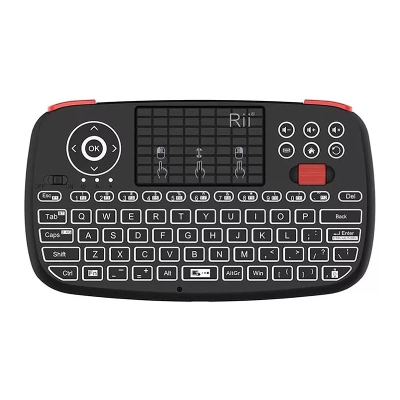 Mini teclado Rii i4 en idioma español, el teclado definitivo con una gran versatilidad y funciones, de conexión por bluetooth o por conexión de receptor USB. Cuenta con batería recargable de gran capacidad. Cuenta con retro iluminación (se puede activar y desactiva). Pantalla multi gestos para usar como un mouse, scroll para subir y bajar páginas. Material de alta resistencia con teclas de goma suave agradables al tacto y presión.