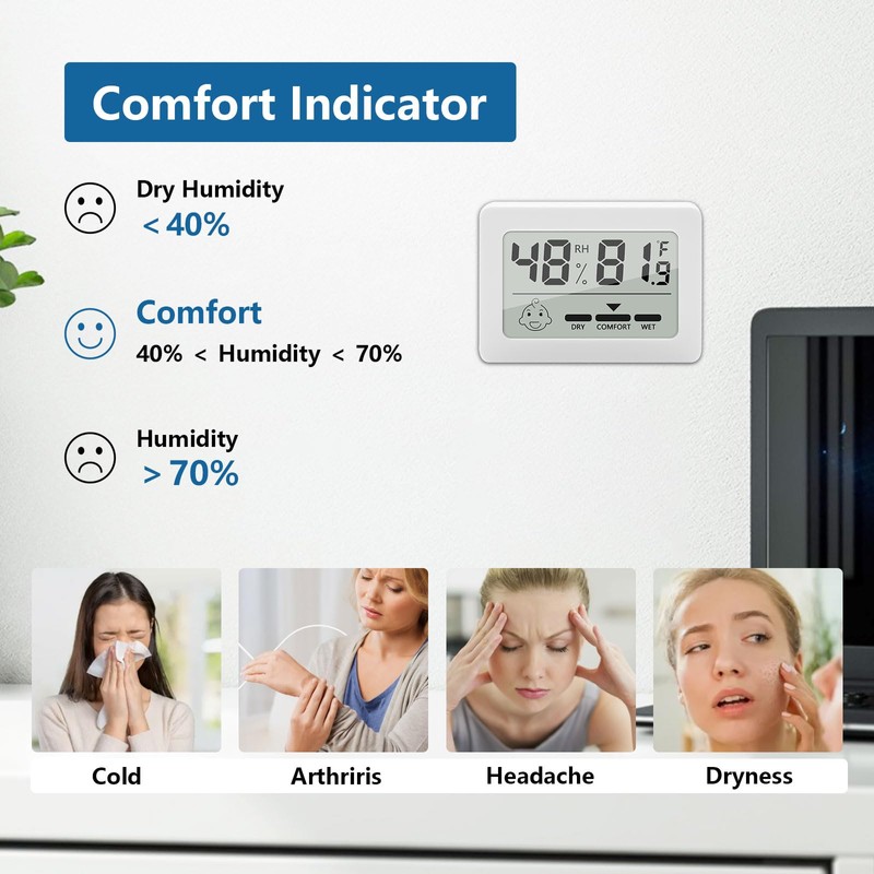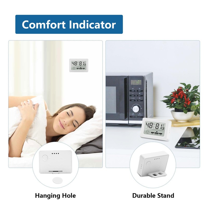 - Air comfort display: our thermal hygrometer inside thanks to the air comfort indicator with 2 smile symbols, you can easily monitor the current air conditions. This is ideal for optimising living conditions and protecting the health of your family. By targeted heating and ventilation, colds, dry skin, asthma and mould can be prevented.