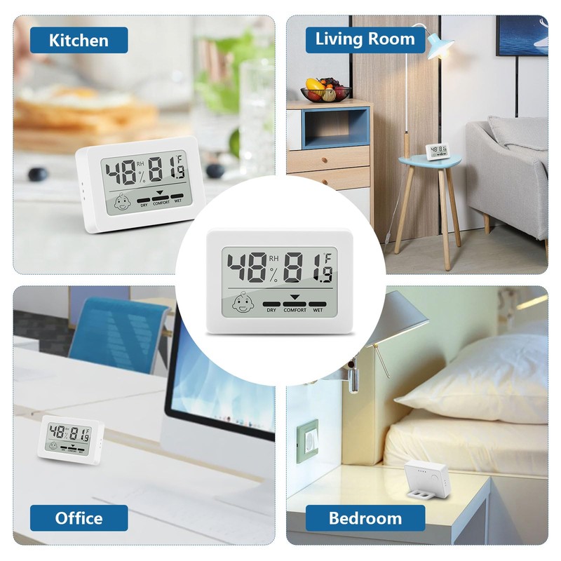 - Flexible mounting options: Our thermometer with humidity meter offers three placement options (upright, table stand, wall mounting with double-sided tape) to flexibly adapt to different rooms. The small and compact size allows for space-saving use and is perfect for use in the refrigerator, baby room, living room, basement, greenhouse, office, wine cellar and other places.