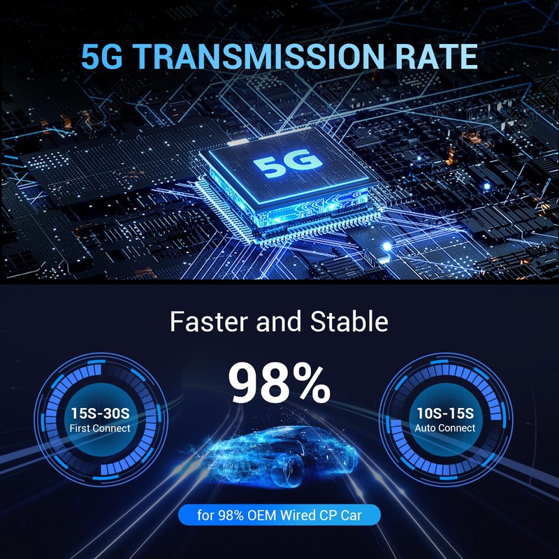 - 【 Faster and Stable 】The CarPlay wireless adapter is built with a 5G chip for fast processing speed and compatibility with 5GHz WiFi rates. This ensures a stable connection, fast response time, and eliminates audio latency. By transmitting unaltered signal sources, enjoy high-quality sound and images. You can easily display all your favorite maps, media, and messaging apps on the car's display screen.