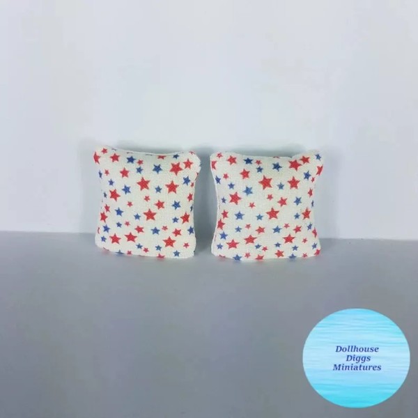 Set of two dollhouse pillows. Tiny red, white and blue stars of various sizes on a white ground. Each one measures about 1 and 1/4 inches square. These small, plush pillows offer a big dose of style and color. Add a touch of charm to any mini setting. Miniature pillows are a great way to add a bit of fun and personality to any space.