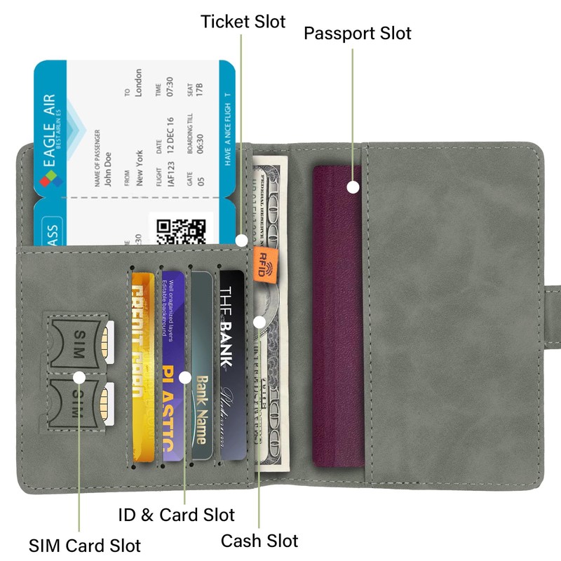 - Multiple compartments: This travel wallet passport cover has multiple compartments, 1 passport pocket, 2 SIM card slots, 4 bank card slots, 1 ticket compartment, 1 money compartment. 1 travel wallet for your important items.