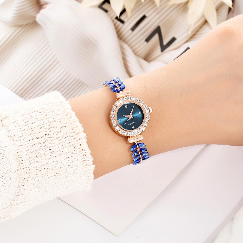 MINILUJIA Elegant Luxury Womens Wrist Watch with Small Gold Dial Bling Green Olive Leaves Rhinestones Watch Band Dress Analog Slim Bracelet Lady Watch Adjustable Strap, blue