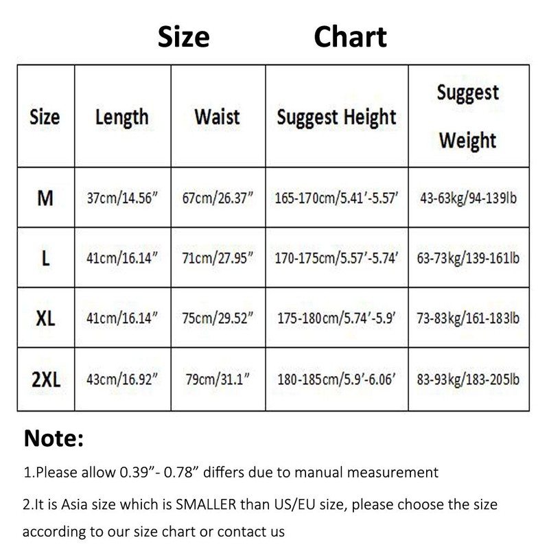XL:Length: 41cm/16.14”, Waist: 75cm/29.52”, Suggest Height: 175-180cm/5.74’-5.9’, Suggest Weight: 73-83kg/161-183lb