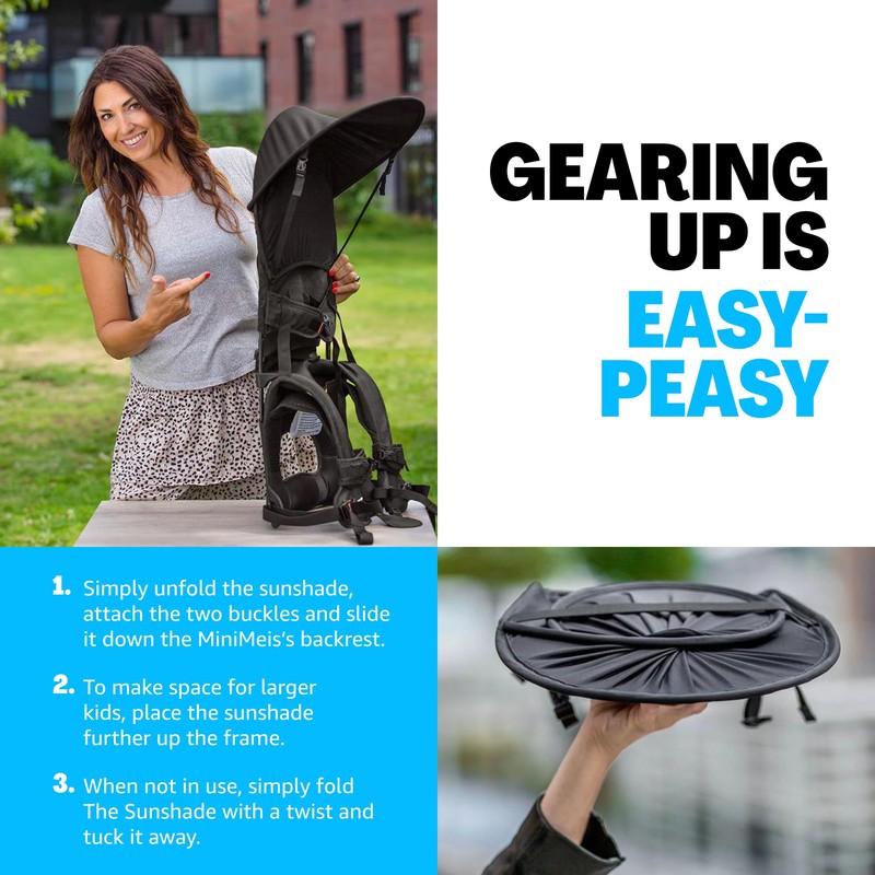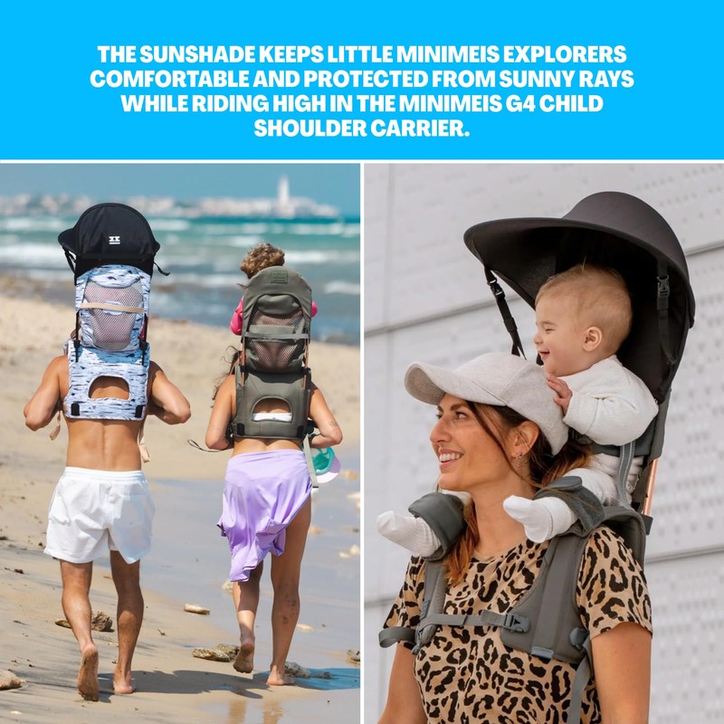 - MINIMEIS G4 SUNSHADE - The Sunshade keeps little MiniMeis explorers comfortable and protected from sunny rays while riding high in the MiniMeis G4 child shoulder carrier. Suitable for children from about 6 months to 4 years old.