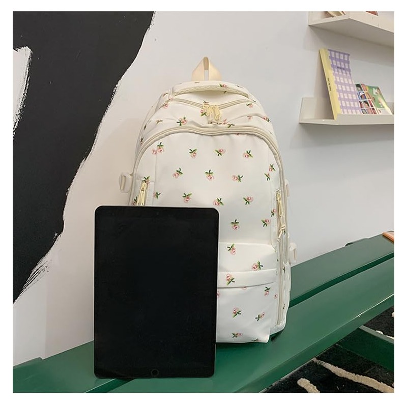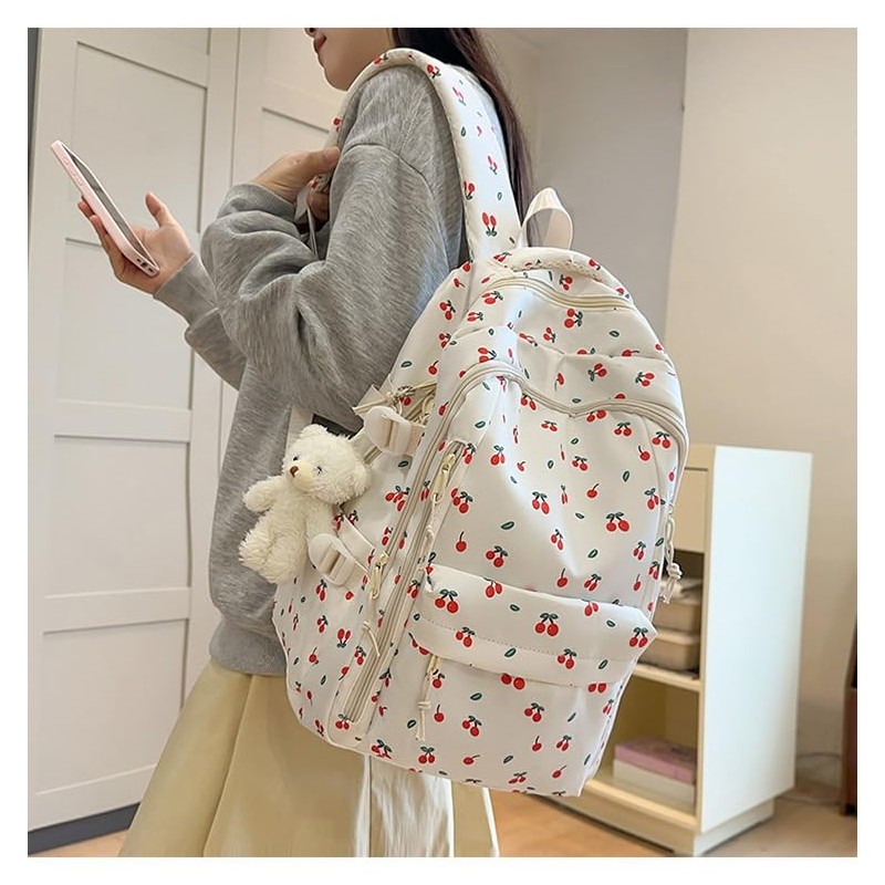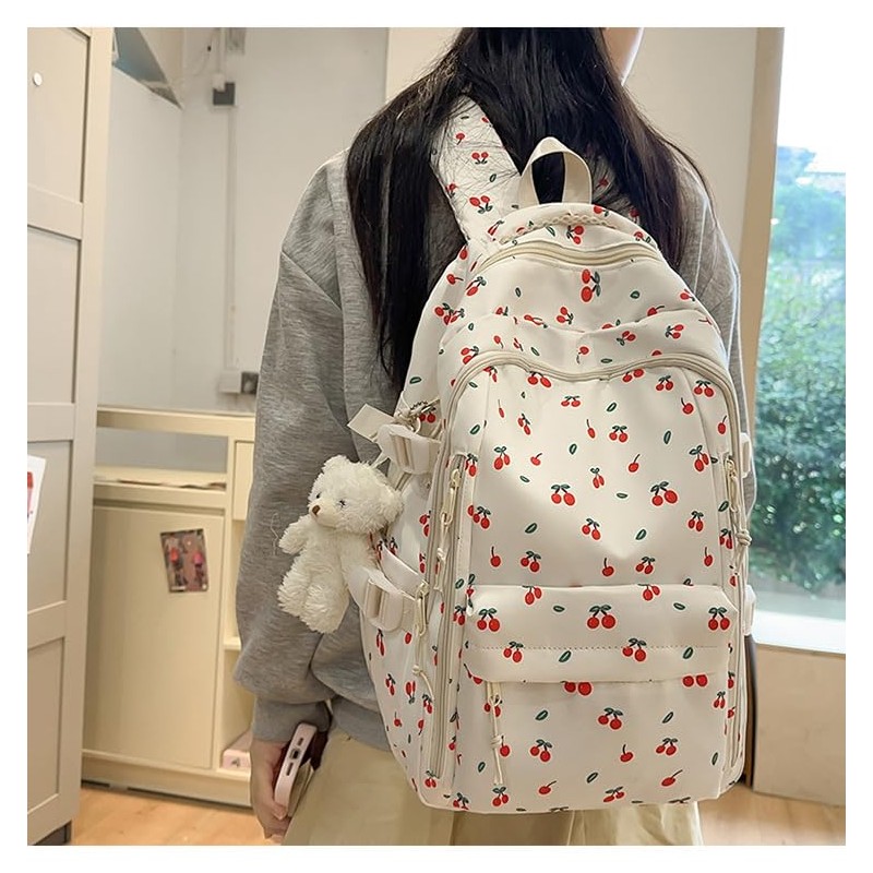 MININAI Cute Floral Printed Backpack for Women Preppy Kawaii Aesthetic Laptop Bookbag Coquette Work Travel College Daypack (Cherry)