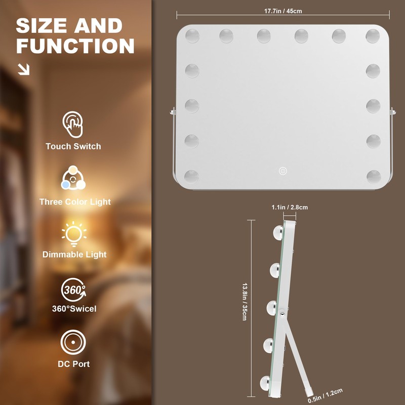 - Adjustable Brightness and Color Temperature:This hollywood vanity mirror with lights features stepless dimming (20%-100%) and adjustable 3 color temperature. Customize lighting from warm glow to daylight-bright for flawless makeup application in any environment. The lighted makeup mirror ensures perfect illumination every time