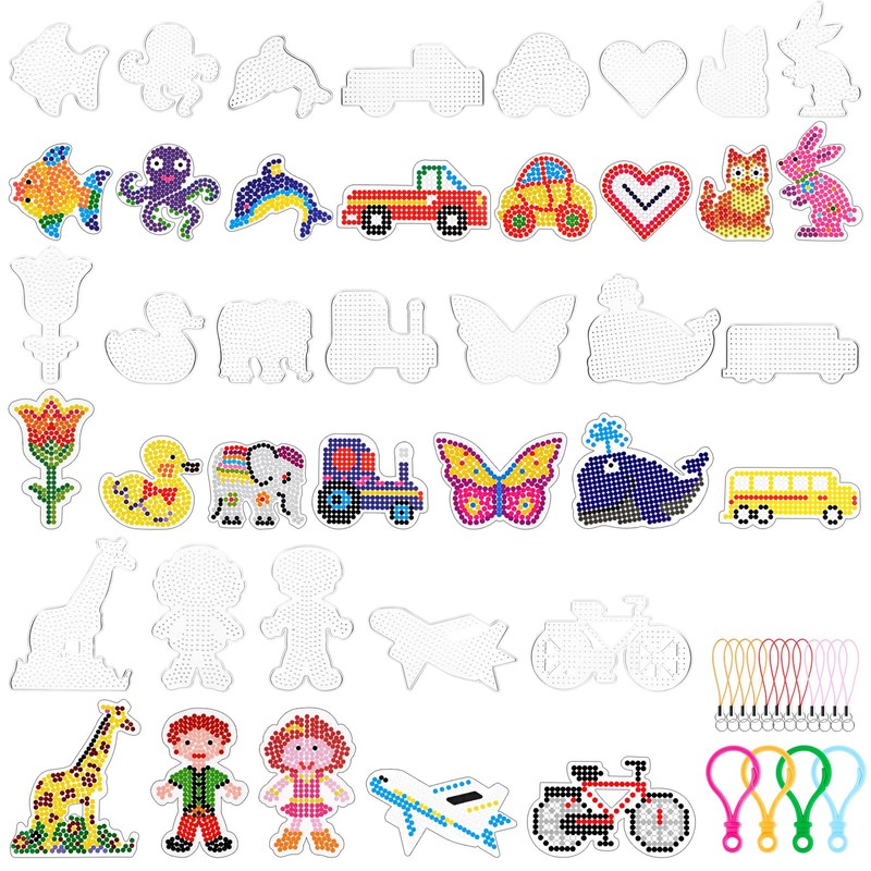 - Enrichment set: our ironing beads plates set offers 61 high-quality accessories. These include 20 ironing beads templates, 20 coloured pattern cards, 5 key rings, 12 mobile phone straps and 4 clips, perfect fit for 5 mm ironing beads. The templates are diverse and show different motifs, such as bicycles, ducklings, hearts, which offer children a variety of possibilities in creative crafts. Please note that this set does not contain ironing beads.